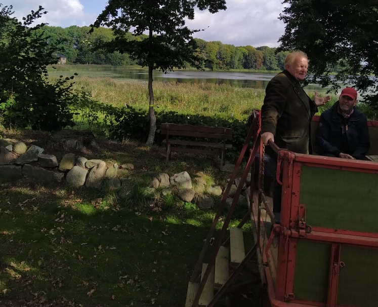 Sicher fuhren unsere Treckerfahrer Oke und Horst mit uns weiter nach Sörupholz. Karl Jacob zeigte uns die höchste Erhebung von etwa 50 m in diesem Bereich. Durch die Kielstau und Bondenau ist in früheren Zeiten wahrscheinlich hier die Möglichkeit gewesen, per Schiff von der Nordsee zur Ostsee zu fahren. Einige Hinweise in diesem Bereich bezeugen von Werften, und diverse Mühlen, die vom Wasser betrieben wurden. Noch sind hier zum Teil Rückstände von Mooren zu finden, die über die Jahre durch Torfabbau und Trockenlegung nicht ausreichend C02 speichern.